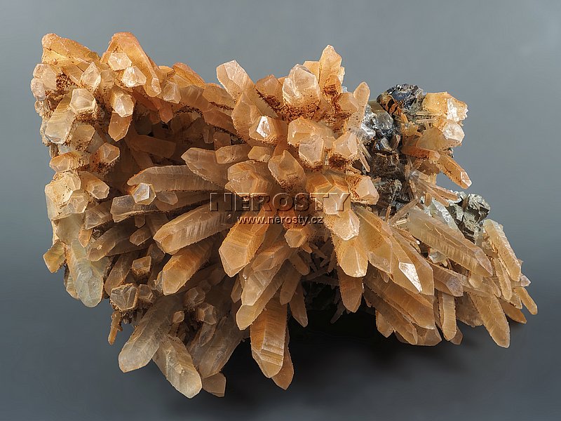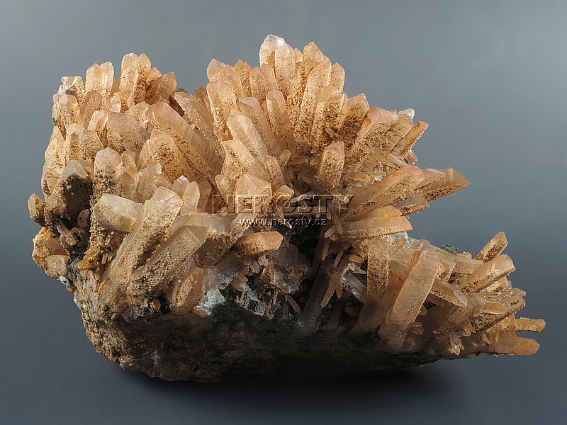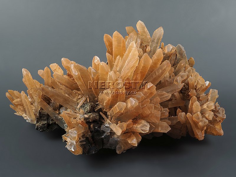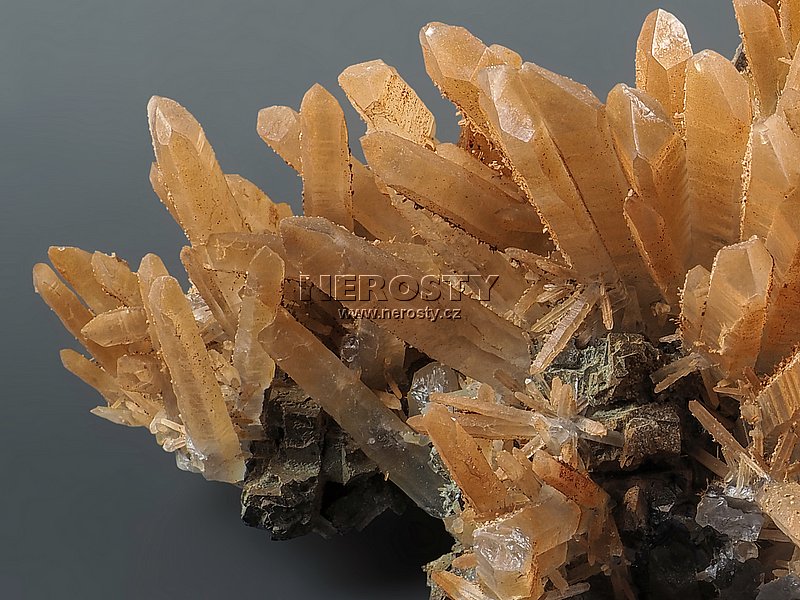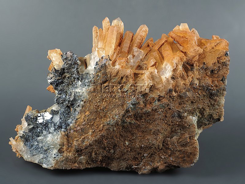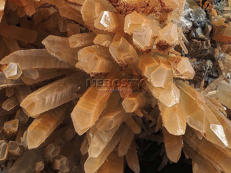 Až 45 mm dlouhé krystaly křemene narůstají na podložce tvořené směsí rudních minerálů.
